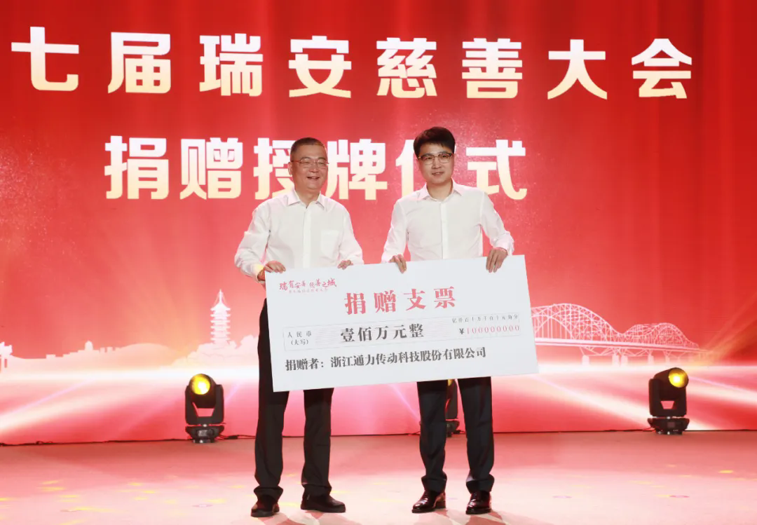 為合力打造共同富裕示范區(qū)縣域標(biāo)桿,響應(yīng)瑞安市委市府號召,通力科技總經(jīng)理項純堅代表通力科技向大會捐贈100萬元。